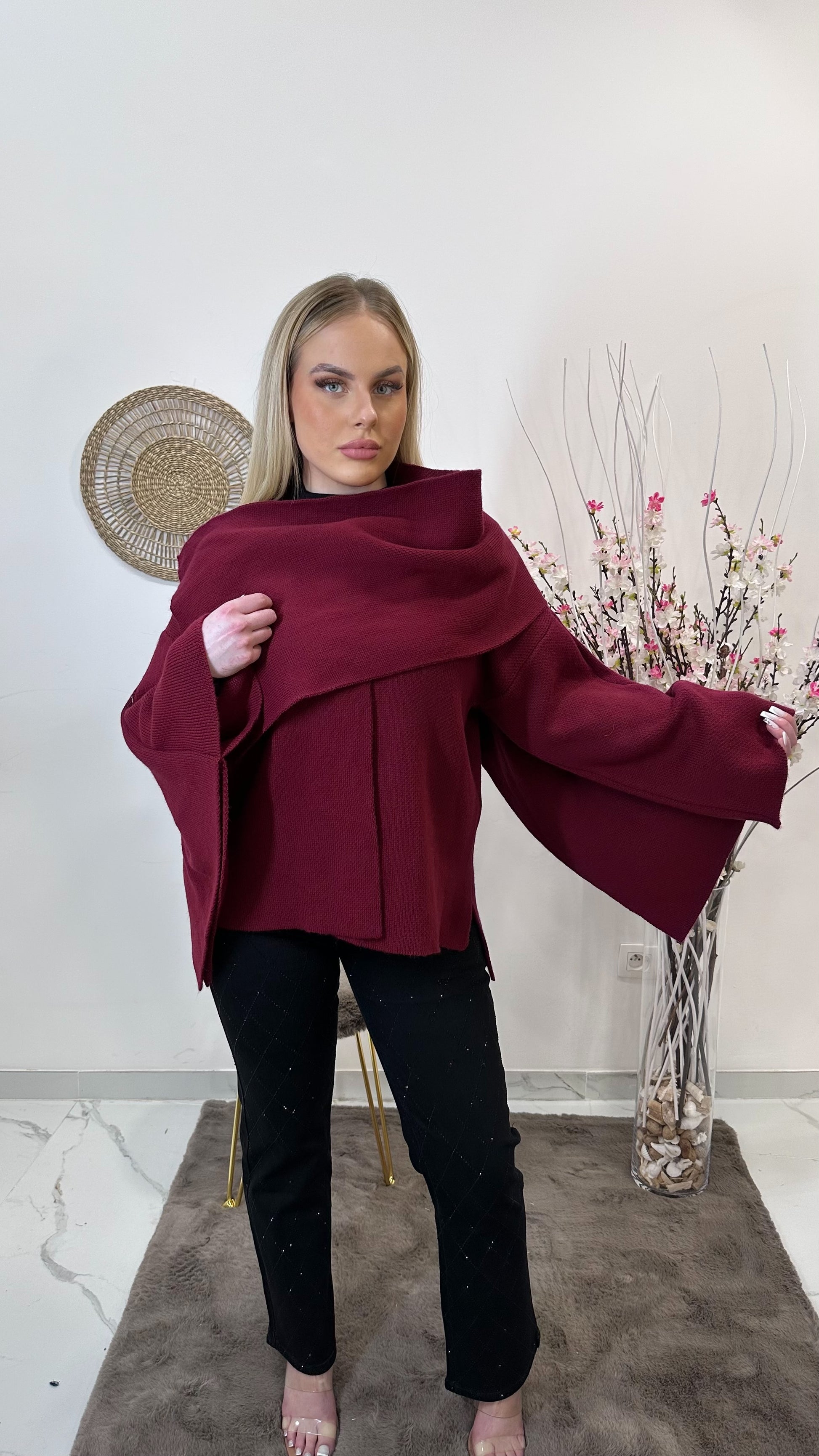 Cape bordeaux avec écharpe intégré.